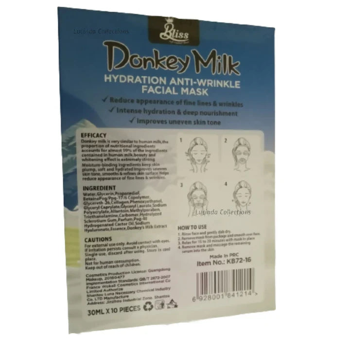 - The 10Pcs Donkey Milk Facial Mask Sheet is infused with nutrient-rich donkey milk to deeply hydrate and rejuvenate your skin.