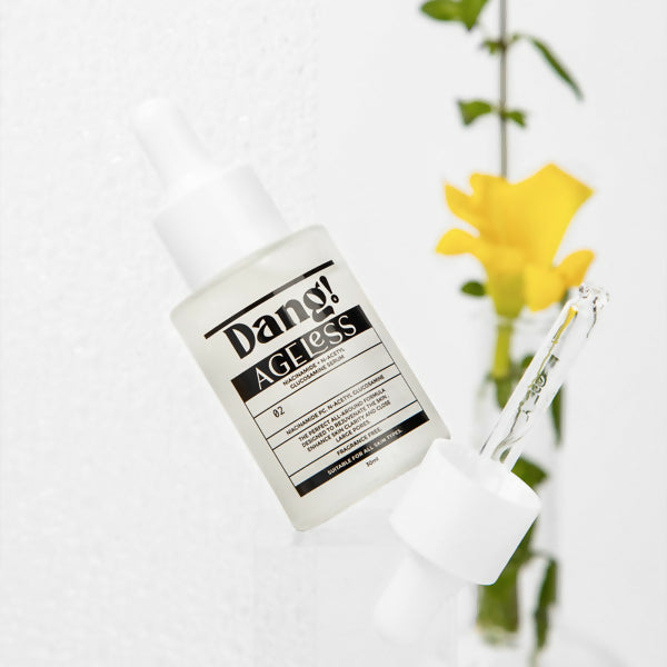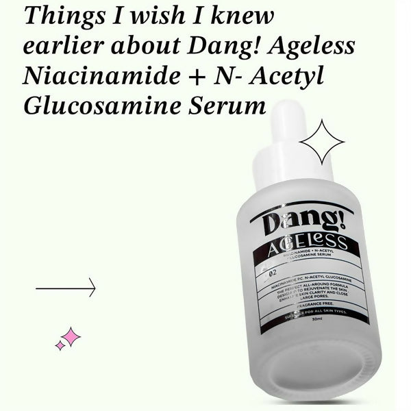 Dang Ageless Niacinamide + N-Acetyl Glucosamine Serum (30ml) is a lightweight serum that combines Vitamin B3 (Niacinamide) and NAG to target acne, wrinkles, and uneven skin tone. It might help reduce breakouts, minimize pores, fade dark spots, and hydrate the skin.