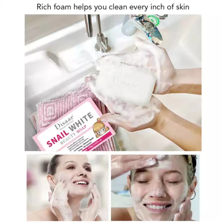 - Snail White Beauty Soap provides a deep cleansing experience while addressing spots and excess oil.