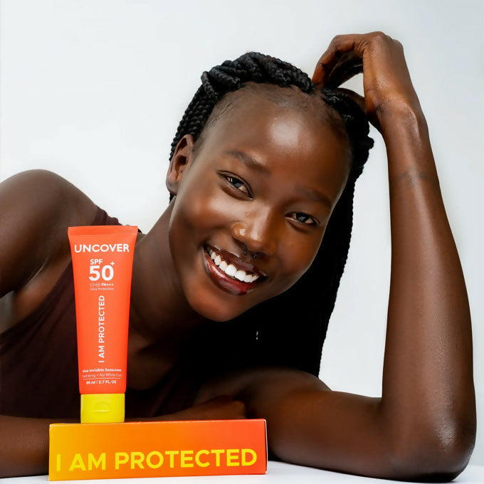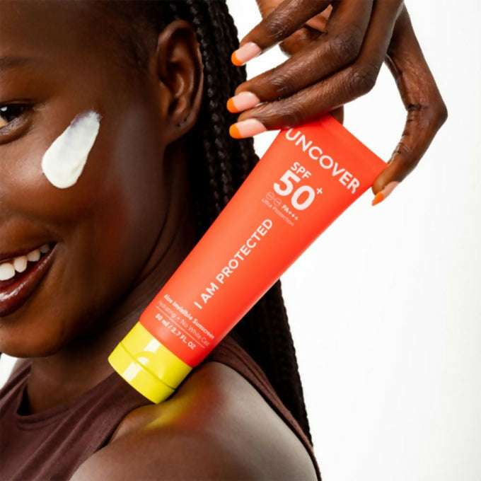 Uncover Aloe Invisible Sunscreen (80ml) is a daily sunscreen that provides broad-spectrum SPF 50+ protection for all skin types. It boasts a lightweight, invisible formula that leaves no white cast, making it comfortable to wear every day. Enriched with Aloe Vera, this sunscreen hydrates and soothes the skin, potentially benefiting those with sensitivities. By blocking UVA and UVB rays, it shields your skin from sunburn, premature aging, and hyperpigmentation. However, remember to reapply sunscreen every two hours for optimal protection, especially after sweating or swimming. While Uncover Aloe Invisible Sunscreen might be a great choice, check the label for water resistance and consider a patch test if you have sensitive skin. Daily sunscreen use is key for healthy skin, and this option offers broad protection with a lightweight, potentially hydrating feel.