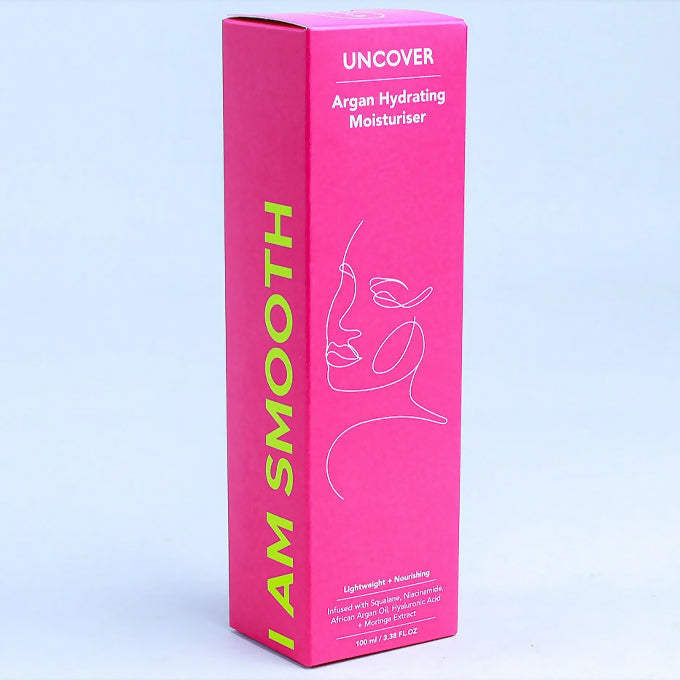 e Uncover Argan Hydrating Moisturiser – 100ml is packed with nourishing ingredients to keep your skin healthy and hydrated. Squalene, a plant-derived oil, helps lock in moisture and soothe irritation. Niacinamide, a form of vitamin B3, works to refine texture, reduce redness, and minimize pores. African Argan Oil, rich in antioxidants and vitamins, nourishes and hydrates while potentially improving elasticity. Hyaluronic Acid, a natural humectant, plumps the skin by holding onto water molecules. Finally, Moringa Extract, with its anti-inflammatory and antibacterial properties, helps shield skin from damage. This combination of ingredients makes the Uncover Argan Hydrating Moisturiser suitable for all skin types, even oily skin, thanks to its lightweight and oil-free formula.
